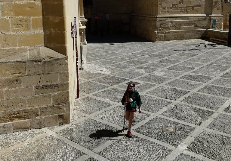 Our drone video journey kicks off at the pilgrims’ hostel in Plaza de la Alameda, a vital hub for travelers on the Camino.